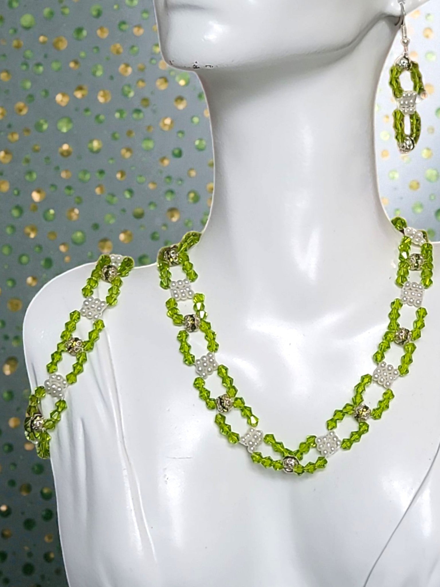 The olive crystals evoke healing, wisdom, and spiritual grounding, while the white pearls symbolize purity, renewal, and divine light. Together, they form a wearable covenant—perfect for ceremonial presence, faith-based gatherings, or everyday empowerment. "Anointed Harmony" is more than adornment—it's a declaration of purpose and peace.