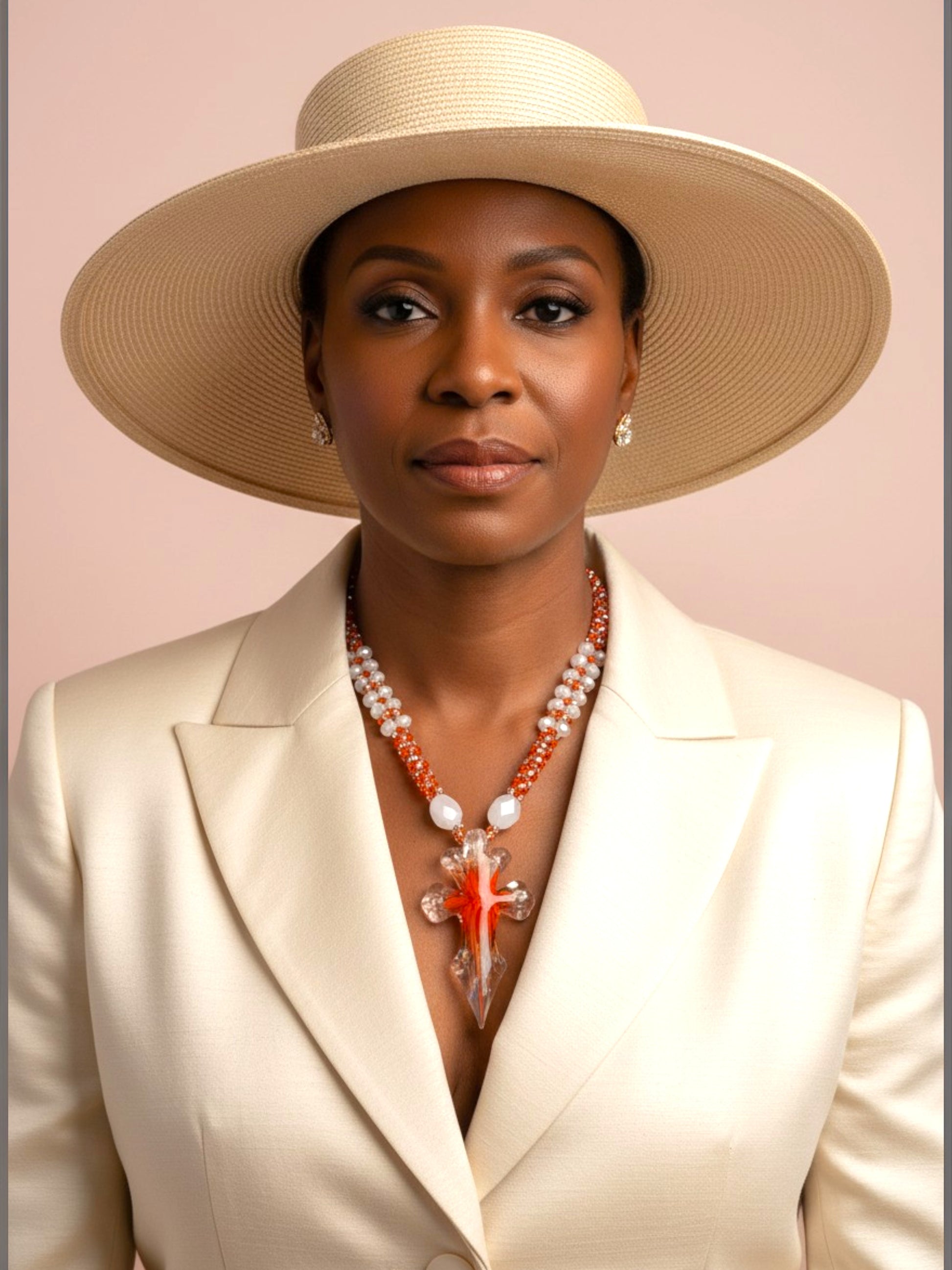 Hand‑strung with alternating white and vibrant red-orange beads, the necklace carries a rhythm of purity and passion—softness and strength held together in perfect balance. The design sits beautifully against the skin, making it a striking statement for worship, celebration, or any moment when you want your spirit to speak before you do.