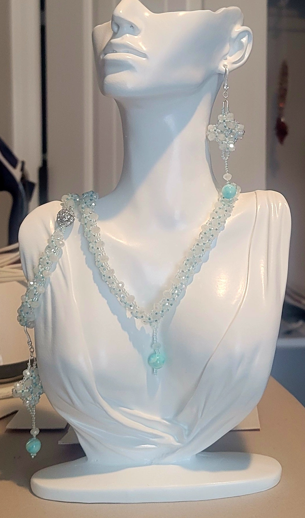 "Garden of Clarity" is a handcrafted three-piece jewelry set that embodies spiritual freshness, emotional healing, and sacred simplicity. Featuring Swarovski crystals in white and Mint Jade, this coordinated necklace, bracelet, and earring trio is woven with gentle symmetry and luminous intention.