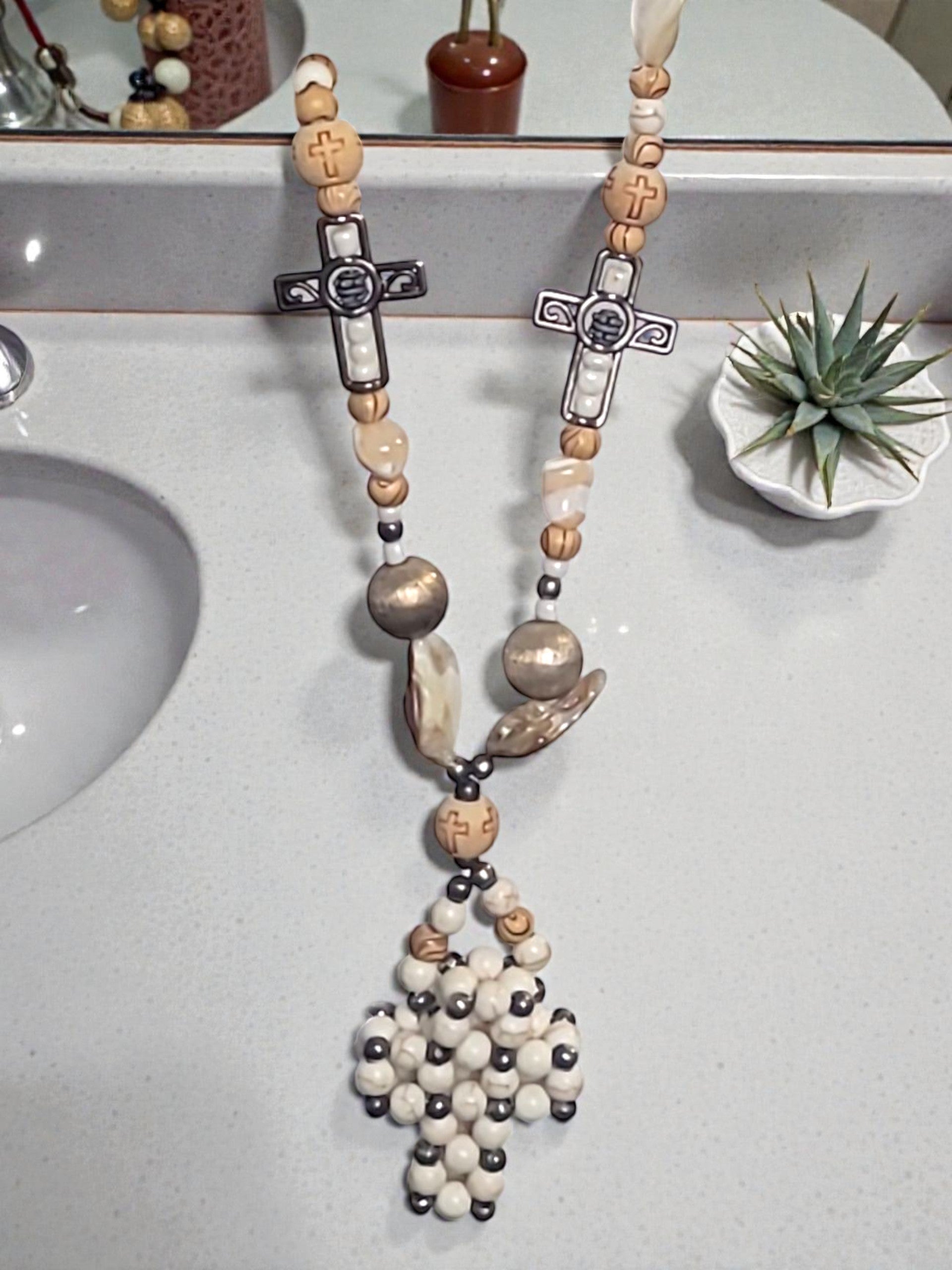 This 3-dimensional cross necklace is a striking fusion of earthy elegance and spiritual depth. Handcrafted with smooth white jade and richly grained coffee wood, each bead is thoughtfully placed to form a layered cross that radiates serenity and strength. The creamy white jade evokes purity and healing, while the warm tones of coffee wood ground the piece in natural resilience.