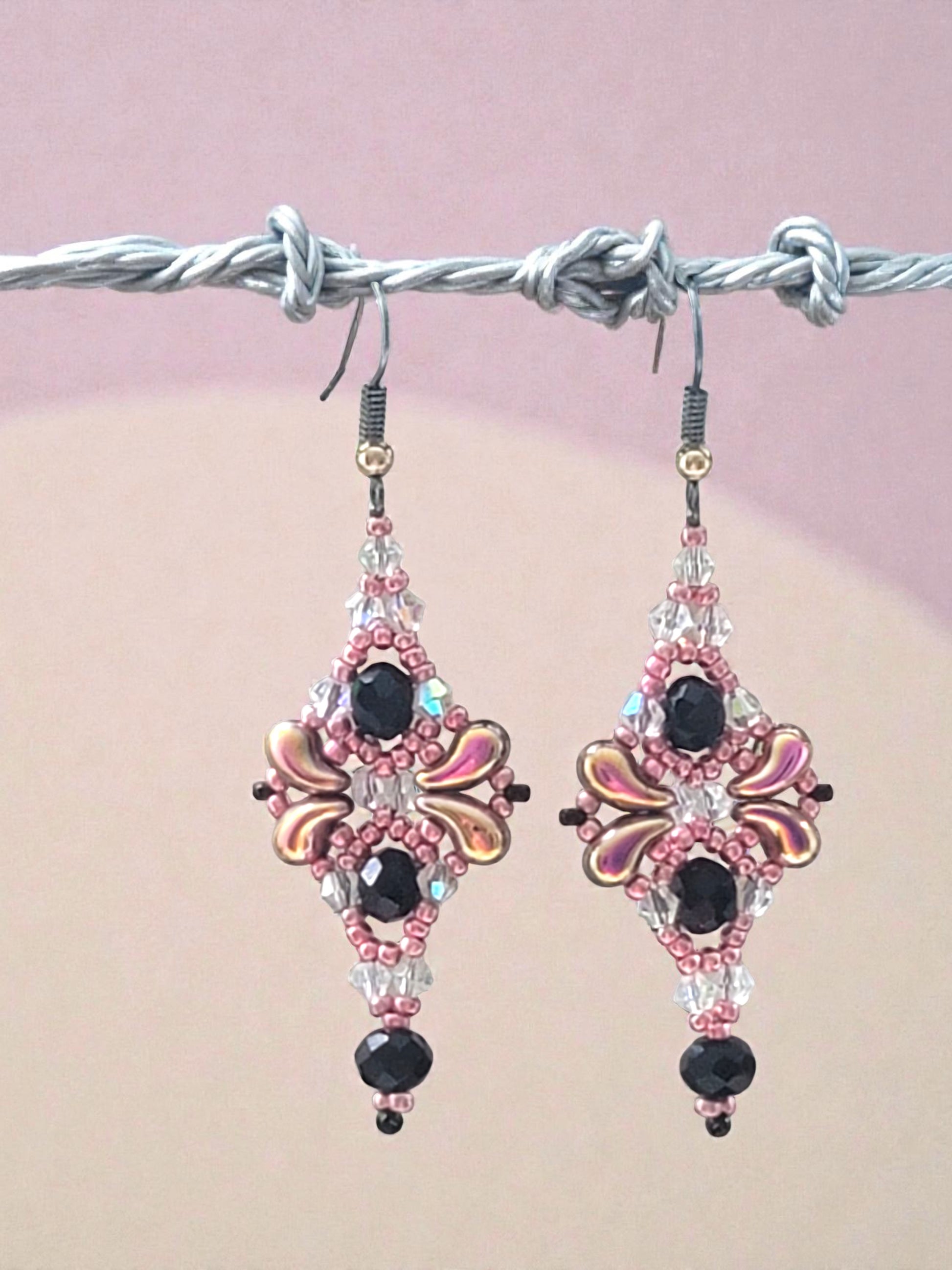 Radiant Bloom earrings are a celebration of inner brilliance and sacred resilience. Handcrafted with paisley-inspired symmetry and adorned with Swarovski crystals and pearls, each pair reflects the light of healing and transformation. Petal-shaped metallic beads in rose-gold gradients evoke blooming strength, while iridescent accents shimmer with divine promise. These earrings are designed for those who rise, reflect, and radiate.