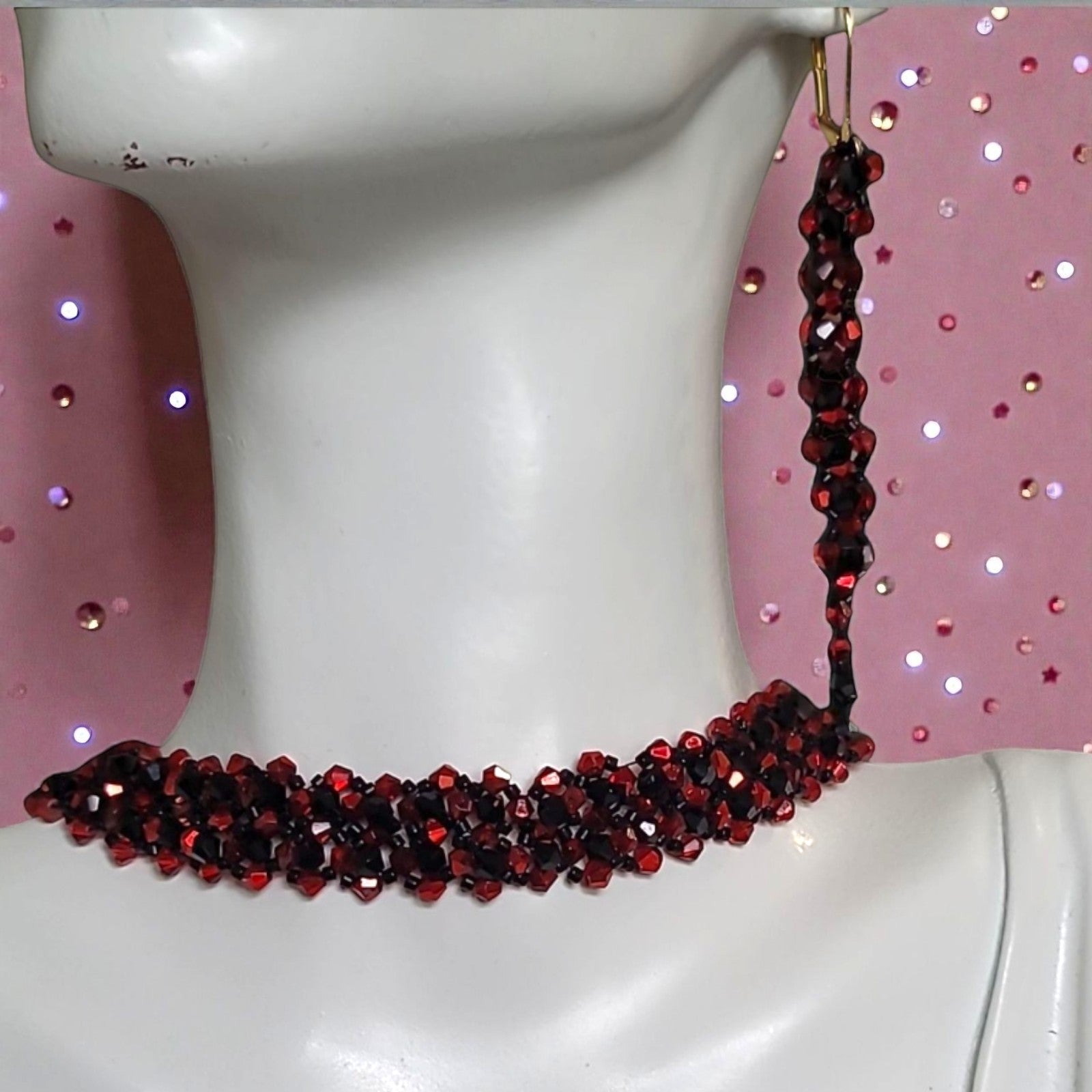 "Veil of Fire" is a handcrafted jewelry set that embodies sacred intensity, spiritual protection, and divine allure. Featuring Swarovski crystals in deep ruby red and jet black, this coordinated necklace and earring duo is woven into a clustered choker design with cascading accents—like embers glowing beneath a protective veil.