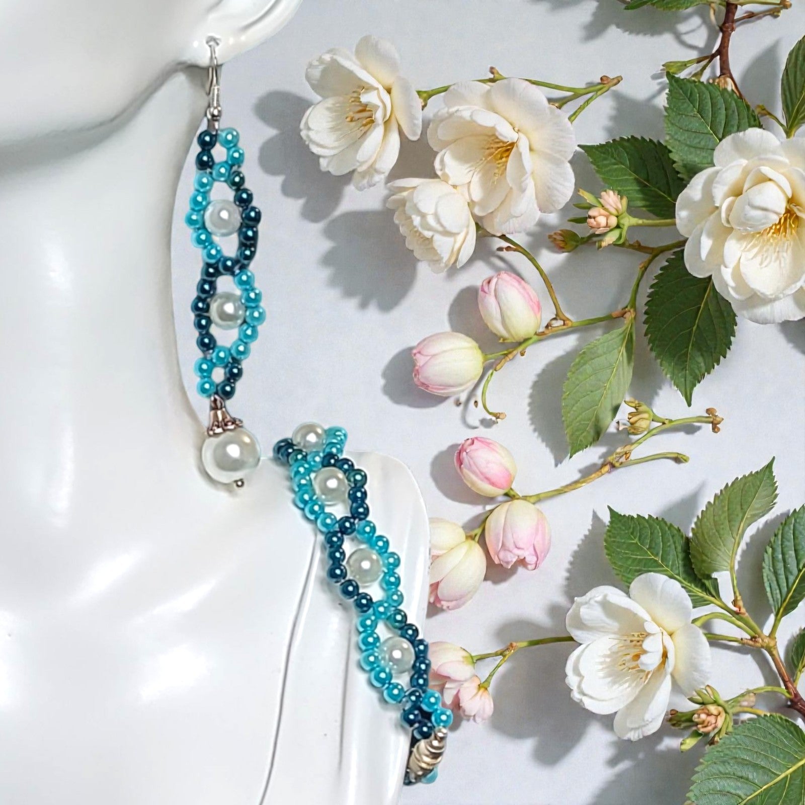Design: Twisted beadwork with flowing symmetry and gold clasp/hooks